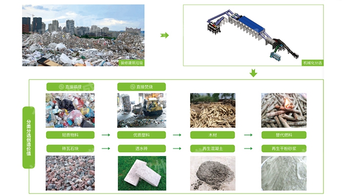 鄭州国产麻豆午夜三级精品設計(jì)的裝潢垃圾資源化處理係統通過對裝(zhuāng)修垃圾進行破碎、尺寸篩分、比重篩分、磁(cí)選、風選、渦電(diàn)流、除塵等工藝,分選出(chū)金屬(shǔ)、木頭、塑料、玻璃、有色金屬、再生骨料和RDF垃圾衍生燃料,實現資源(yuán)回收,再生利用,解決了裝修垃(lā)圾汙染環(huán)境的問題。
