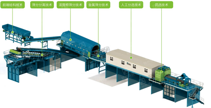 裝修裝(zhuāng)潢垃圾處理係統采用“先分選後破(pò)碎,重分選而輕破碎”的工(gōng)藝理念,避免將雜物隨物料過度(dù)破碎反而增加分選(xuǎn)的難度。