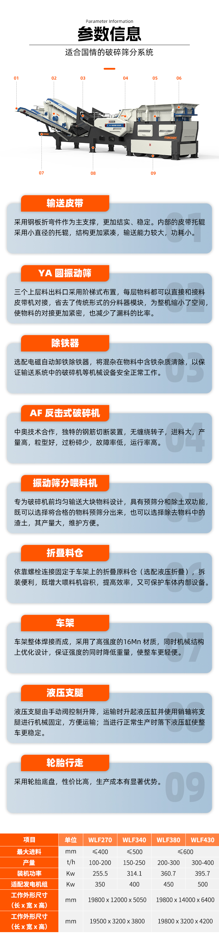 設備配置:WLF輪胎式破碎篩分聯合(hé)一體車